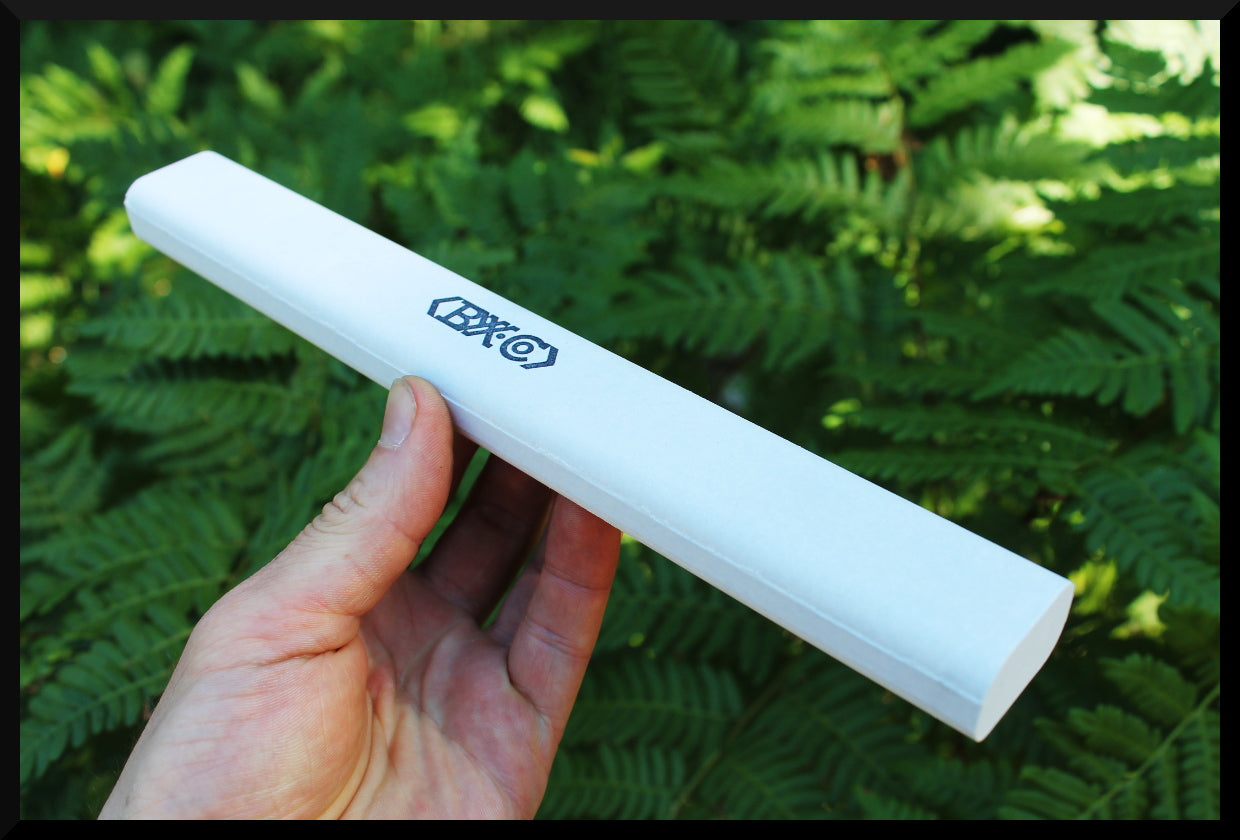 A classic all-purpose stone for use on all manner of knives and tools, the American pattern scythe stone can be used like an abrasive file or held stationary and used like a butcher's steel. The rounded edges of the stone hug the contours of forward-curving or recurved blades like scythes, sickles, brush axes, kukris, or billhooks while the flat gives good contact on straight or upswept edges.
