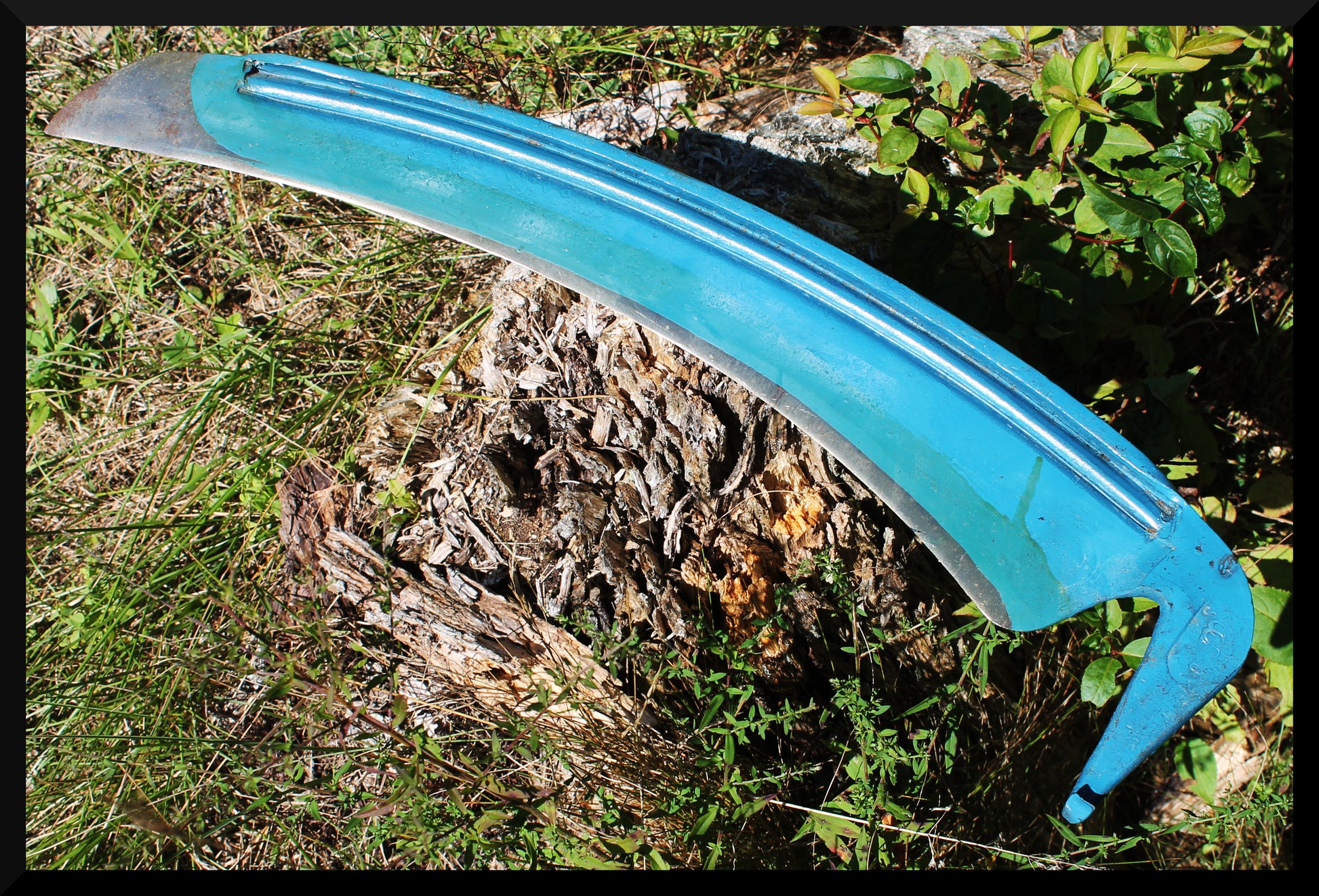 These are good stout weed blades made by the North Wayne Tool Co. in the early 50's. Very robust in build, they are well suited to dealing with heavy and wild growth, including areas with lots of thatch among the live growth. Broad enough to get through the thickest of burdocks and thistles with ease, and tackle isolated green saplings without issue.