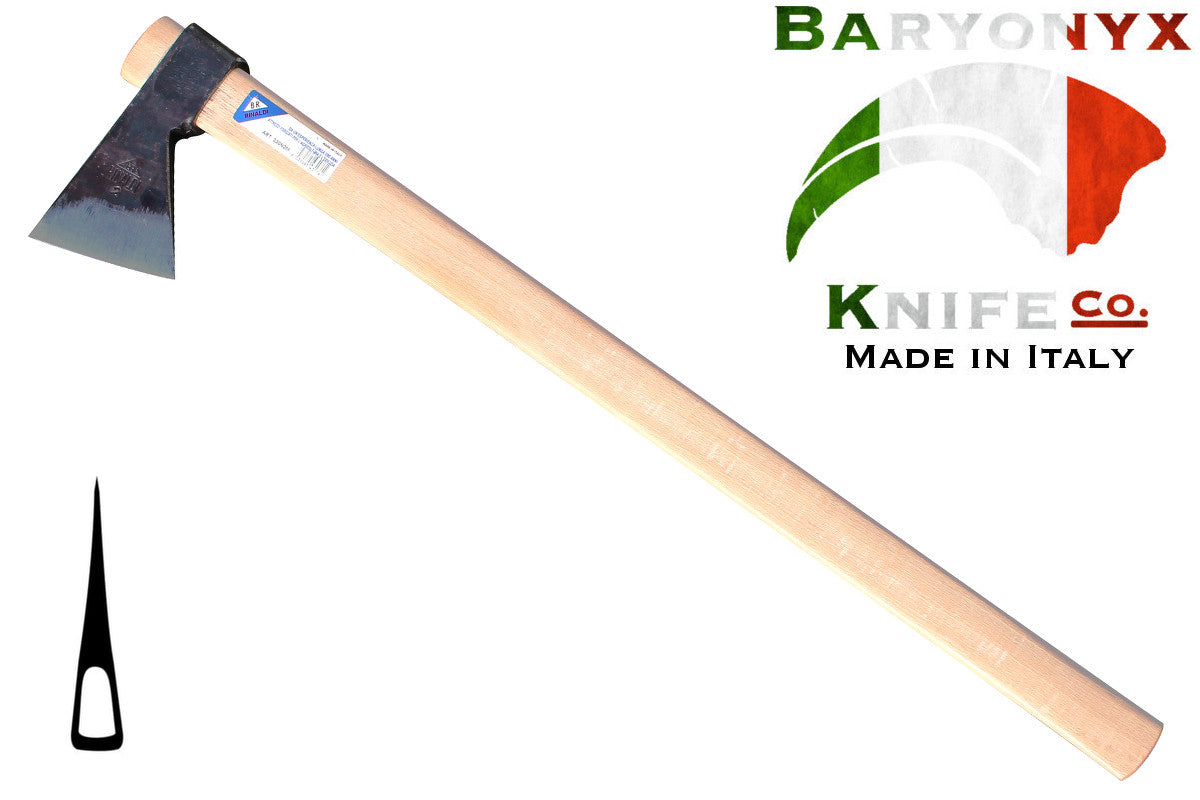 The Calabria pattern axe is a real favorite of ours. The straight bit, while not as deeply penetrating, is more efficient at connecting repeated blows and allows for very rapid felling. Featuring a linear wedge-like (but narrow) taper from the bit to the eye, this axe makes for a good light all-'rounder for both chopping and splitting tasks. The ample, broad haft allows you to either use it as-is or to carve the handle down to your tastes. The eye is tapered and the handle slipped through the top like the handle of a tomahawk or pickaxe, making it easy to fashion a new one in the event of breakage. 700g head.