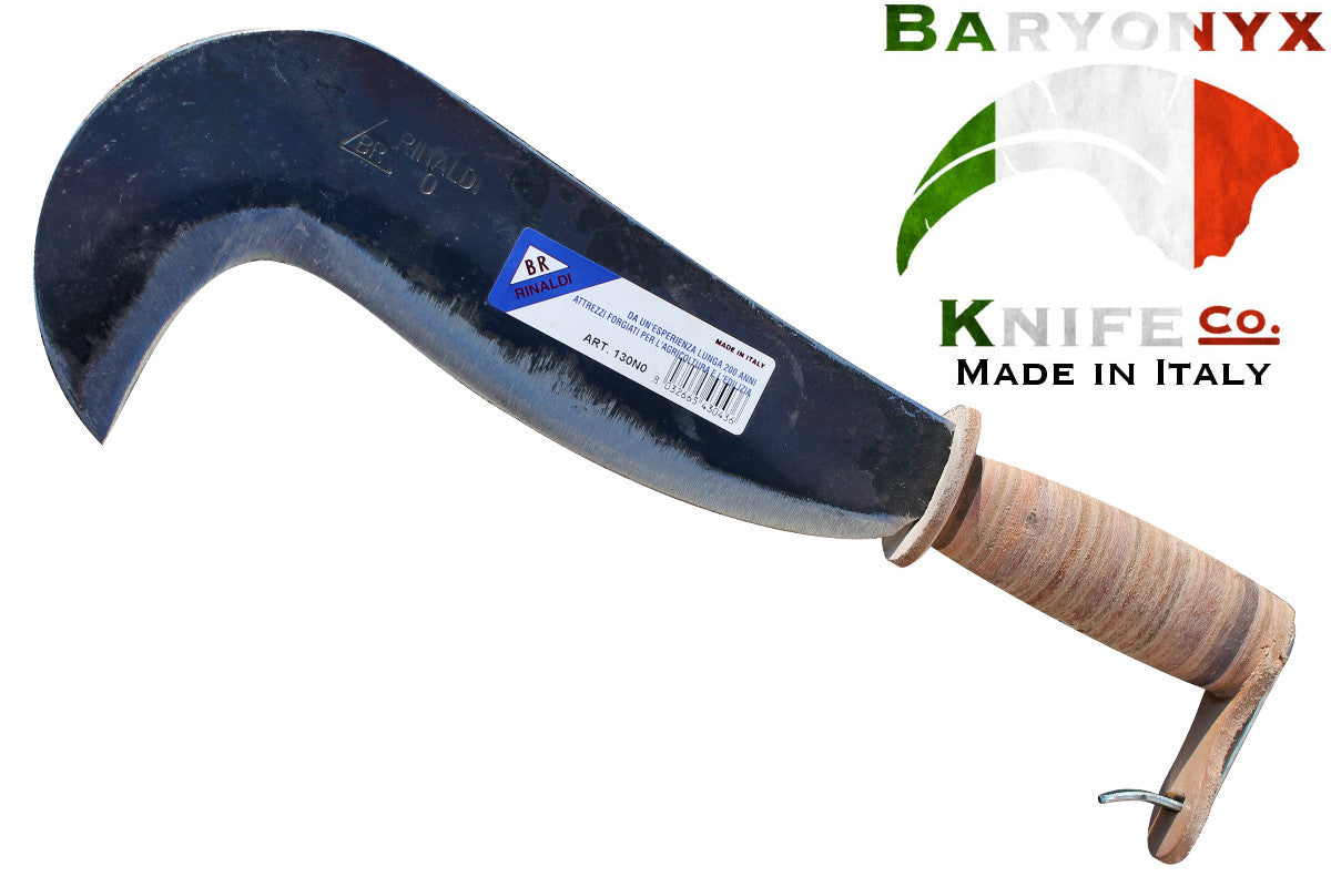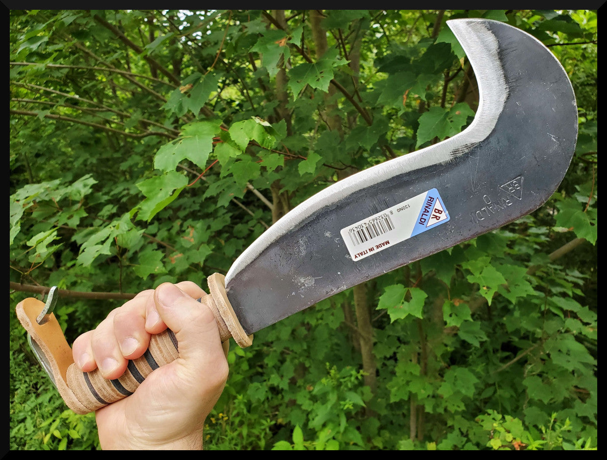 An excellent general-purpose single edged billhook pattern, this "Lucca" pattern features a traditional stacked leather handle that wicks away sweat from the hands for a secure grip even under extended use. The pronounced belly allows for a deep bill for excellent slashing ability without getting in the way of the forte of the blade for wood chopping. This model has a nice distal taper to it for high strength and lively balance.